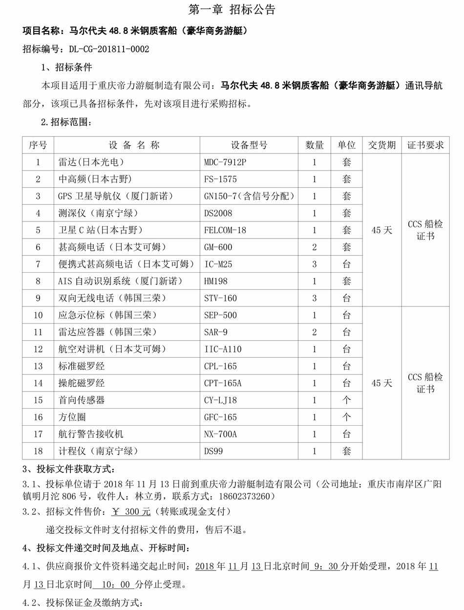 馬爾代夫48.8米鋼質(zhì)客船(豪華商務(wù)游艇)通訊導(dǎo)航部分招標(biāo)公告