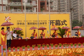 本屆體育節(jié)以“迎奧運?洋世達10年”為主題。來自洋世達集團各樓盤的小區(qū)業(yè)主、洋世達集團的領(lǐng)導(dǎo)和員工,以及各界來賓共3000多人參加了開幕式。重慶市體育局領(lǐng)導(dǎo)譚紅、杜平,南岸區(qū)副區(qū)長楊才明、區(qū)體育局局長徐華維等領(lǐng)導(dǎo)參加了開幕式。在隆重的入場式上,由洋世達集團企業(yè)旗、體育節(jié)會旗、彩旗隊、全體運動員和裁判員近3000人組成的18個方隊,以激情奔放、整齊矯健的步伐邁步入場。在莊嚴(yán)的升國旗、奏國歌儀式后,集團公司常務(wù)副總裁郭坤倫致歡迎辭,重慶市體育局領(lǐng)導(dǎo)發(fā)表了熱情洋溢的講話。在運動員、裁判員代表宣誓后,南岸區(qū)副區(qū)長楊才明宣布本屆體育節(jié)開幕。隨后,進了精彩的文藝節(jié)目表演。